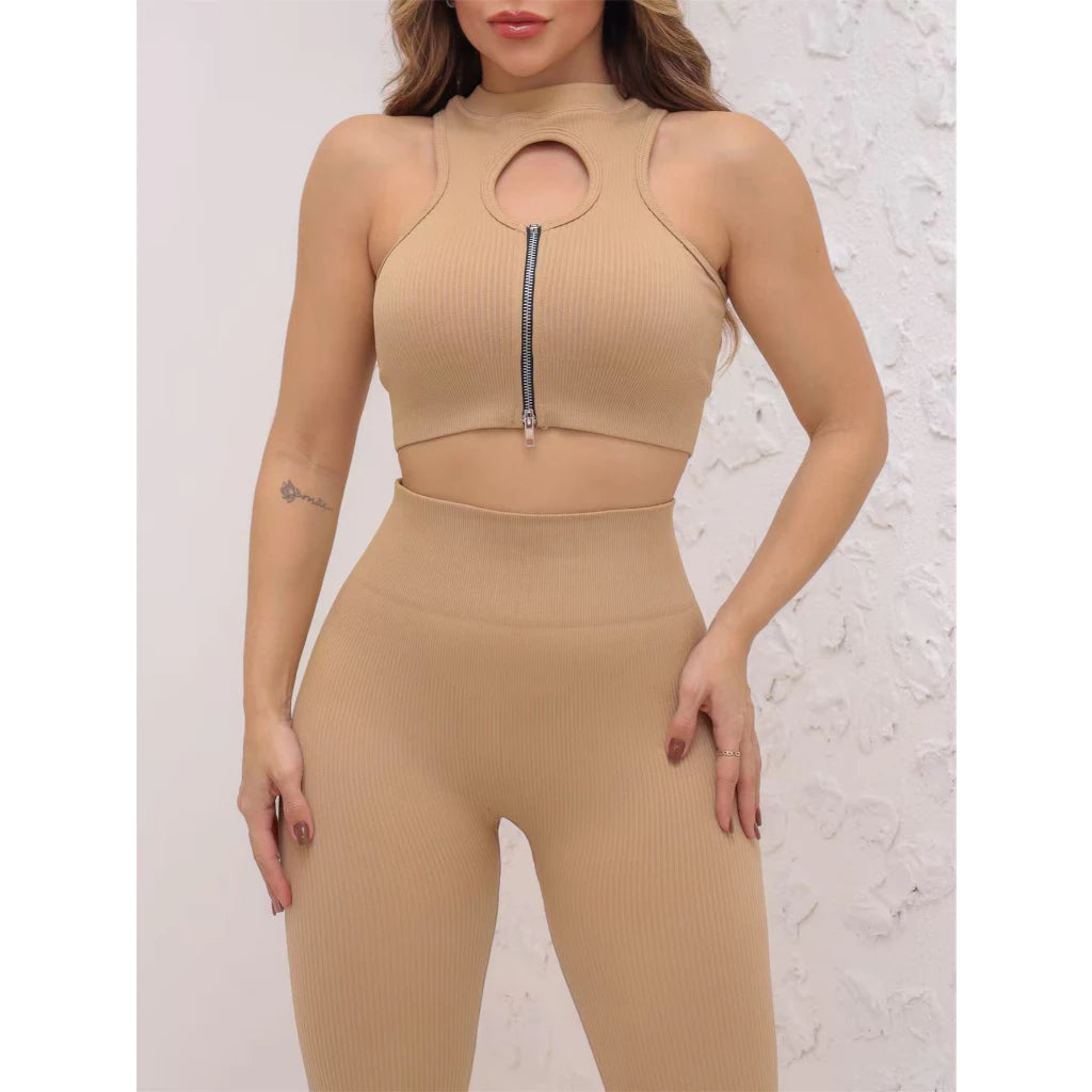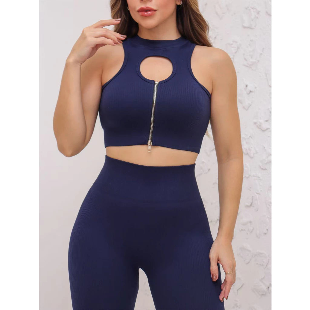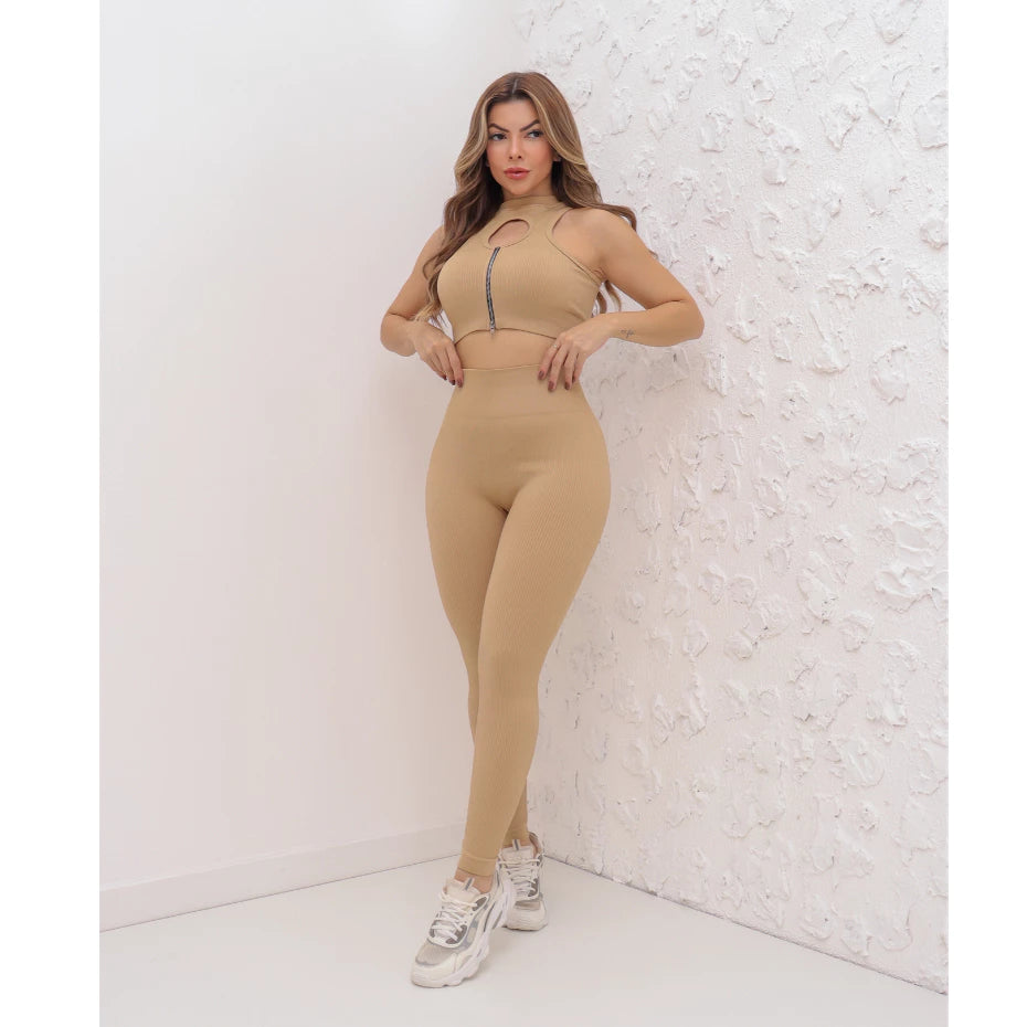 Conjunto Feminino Fitness Canelado em Poliamida – Cropped com Bojo + Calça